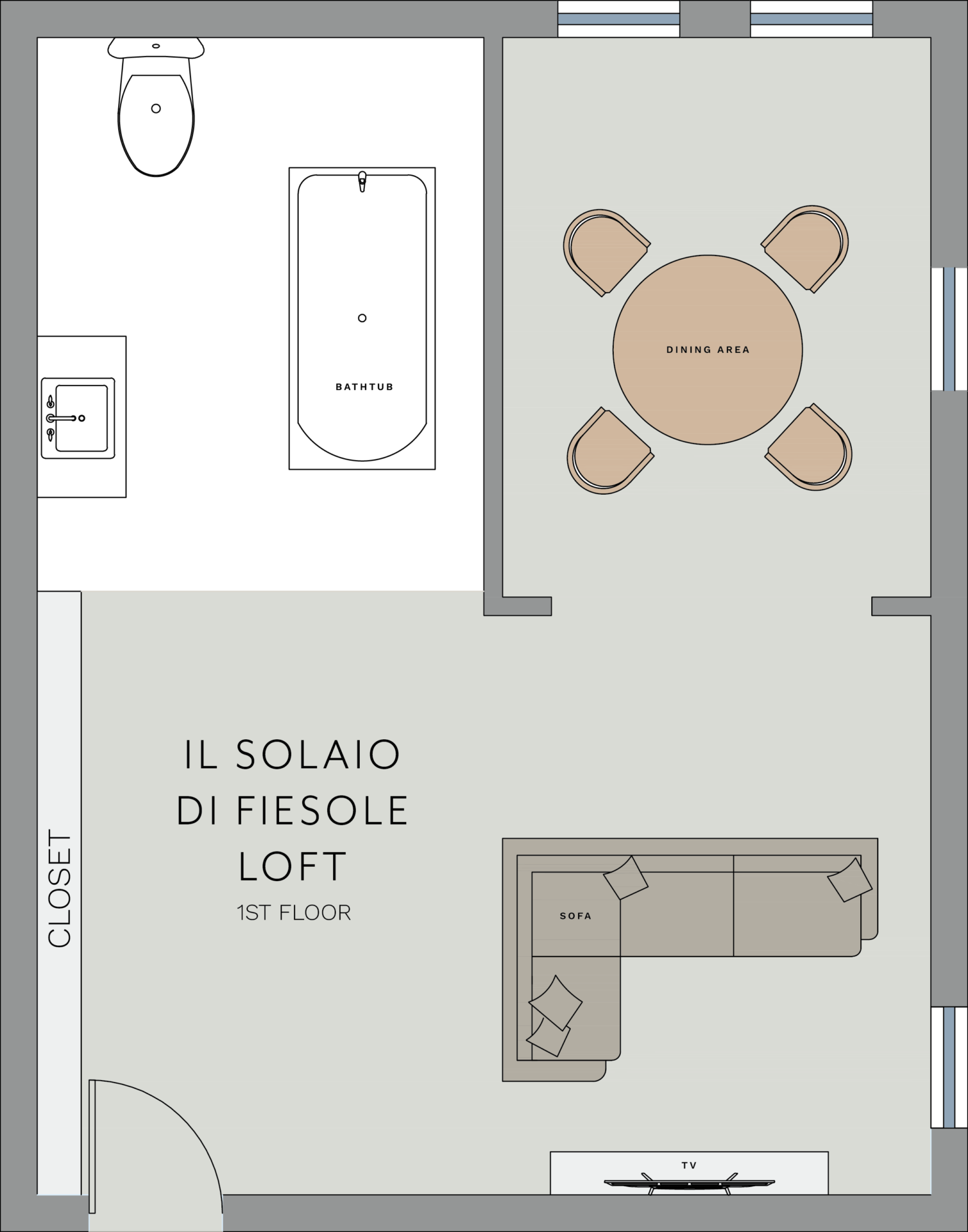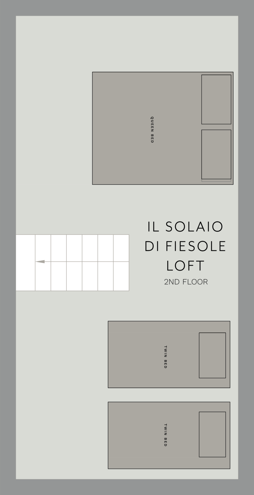 Italian sunlight streams into this bedroom loft which also boasts beautiful views of the olive trees. The first level of the loft has a living room with a comfortable sofa and a large TV perfect for privately watch your favorite movie, and a dining table. The bathroom offers both a shower and a bathtub with views overlooking the green Tuscan hills. From here we have a staircase that takes you up to an open space king-size bedroom next to a secondary open space with two twin beds ideally to use for kids bedroom.