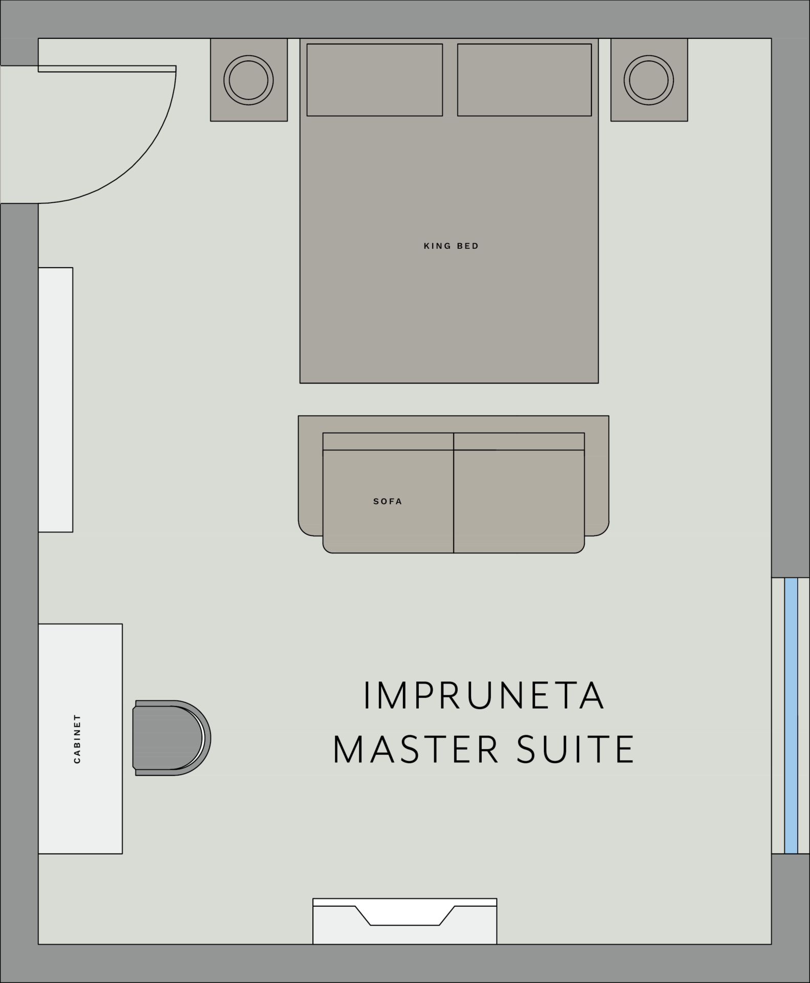 The bedroom has beautiful wood floors, a large ensuite bathroom with Italian Carrara marble that includes a shower, and a bathtub with a window overlooking the Florentine hills. The suite includes a lounge area surrounded by beautiful views of the Tuscan countryside. The master bedroom has a king-size bed, and walk-in closets, and a very elegantly furnished ambiance.